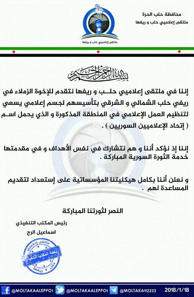 ملتقى اإعلاميي حلب وريفها يبارك تأسيس إتحاد الإعلاميين السوريين