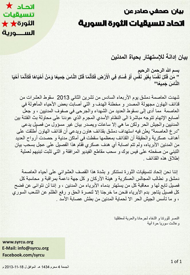 إننا نحن إتحاد تنسيقيات الثورة نستنكر و بشدة هذا القصف العشوائي على أحياء العاصمة دمشق و نطالب المجالس العسكرية و هيئة الأركان و كل جهة داعمة بمراقبة و محاسبة كل فصيل تابع لها و معاقبة كل من يستهتر بدماء الأبرياء من المدنين ، و إننا لن نتوانى عن فضح