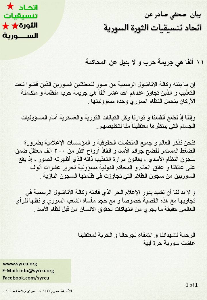 إن ما بثته وكالة الأناضول الرسمية من صور للمعتقلين السورين الذين قضوا تحت التعذيب و الذين تجاوز عددهم أحد عشر ألفاً هي جريمة حرب منظمة و متكاملة الأركان يتحمل النظام السوري وحده مسؤوليتها .