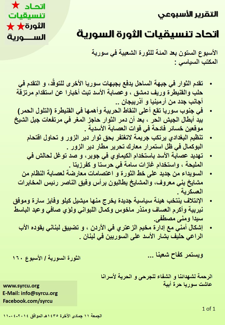 التقرير الاسبوعي جديد الأحداث السياسية , الأسبوع 160 للثورة