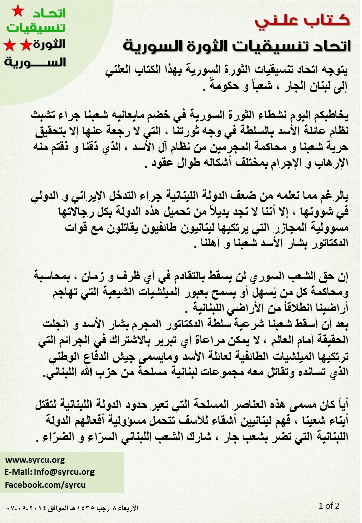 يتوجه اتحاد تنسيقيات الثورة السورية بهذا الكتاب العلني إلى لبنان الجار شعباً و حكومةً .