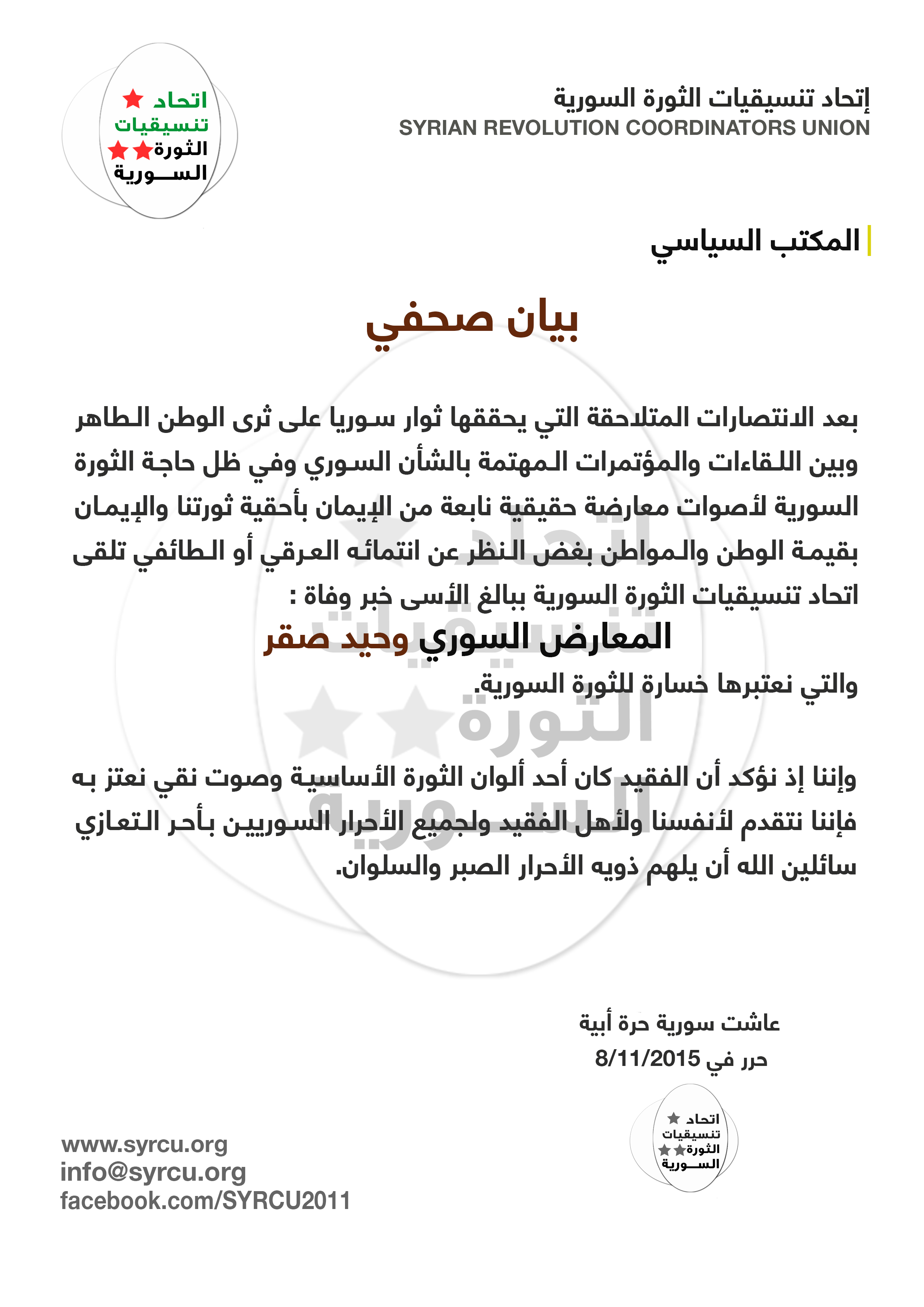 | إتحاد تنسيقيات الثورة السورية #بيان صحفي