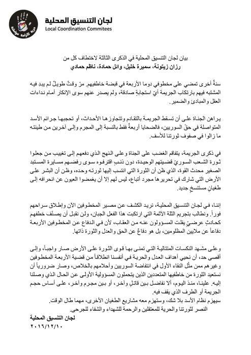 بيان لجان التنسيق المحلية في الذكرى الثالثة لاختطاف كل من