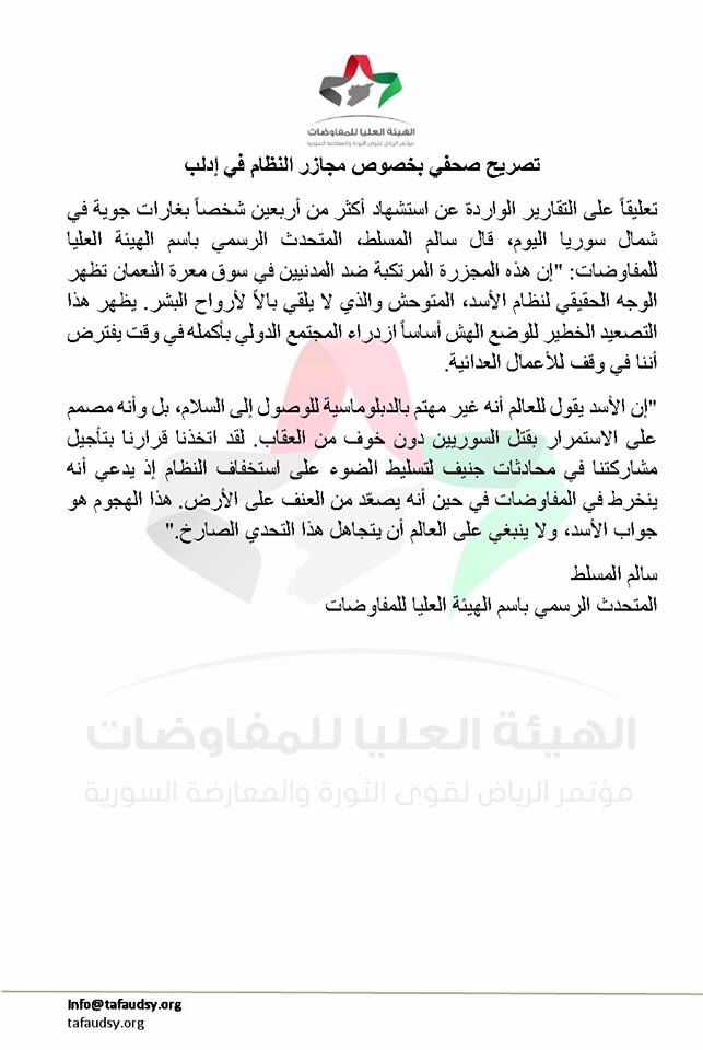 تعليقاً على التقارير الواردة عن استشهاد أكثر من أربعين شخصاً بغارات جوية في شمال سوريا اليوم، قال سالم المسلط، المتحدث الرسمي باسم الهيئة العليا للمفاوضات: "إن هذه المجزرة المرتكبة ضد المدنيين في سوق معرة النعمان تظهر الوجه الحقيقي لنظام الأسد، المتوحش والذي لا يلقي بالاً لأرواح البشر. يظهر هذا التصعيد الخطير للوضع الهش أساساً ازدراء المجتمع الدولي بأكمله في وقت يفترض أننا في وقف للأعمال العدائية.