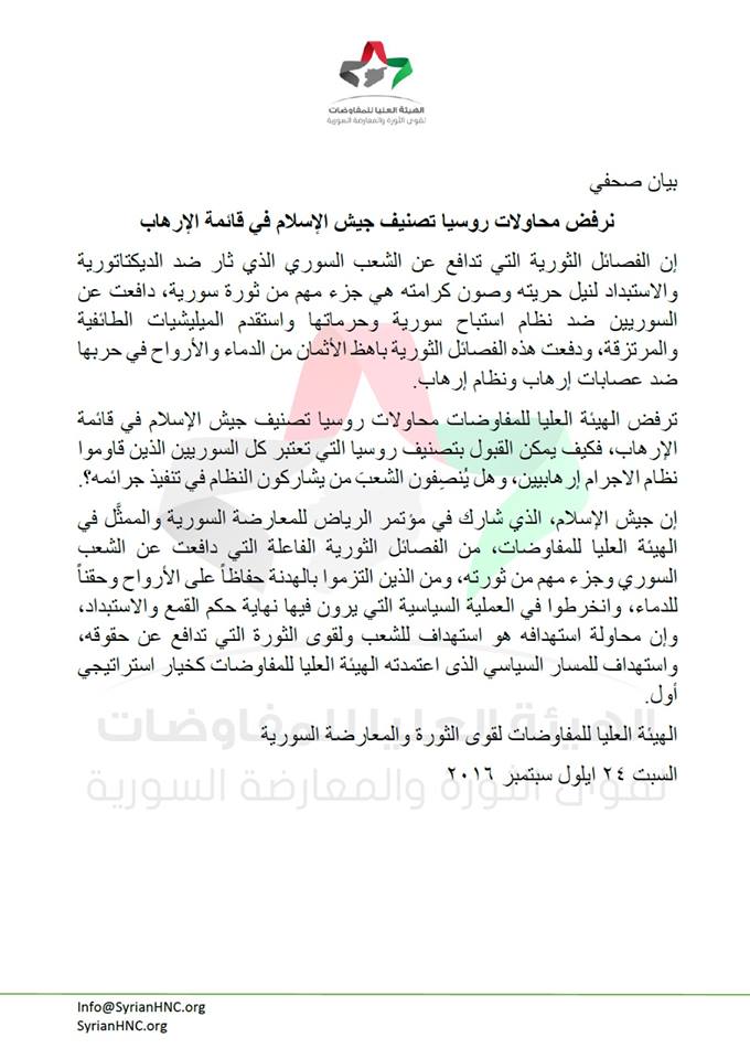 الهيئة العليا للمفاوضات: نرفض محاولات روسيا تصنيف جيش الإسلام في قائمة الإرهاب