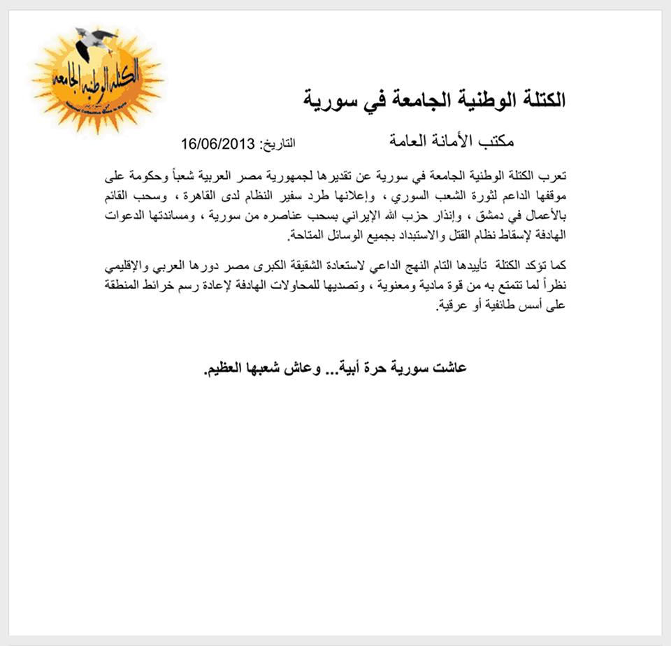 تعرب الكتلة الوطنية الجامعة في سورية عن تقديرها لجمهورية مصر العربية شعباً وحكومة على موقفها الداعم لثورة الشعب السوري ، وإعلانها طرد سفير النظام لدى القاهرة ، وسحب القائم بالأعمال في دمشق ، وإنذار حزب الله الإيراني بسحب عناصره من سورية ، ومساندتها الدعوات الهادفة لإسقاط نظام القتل والاستبداد بجميع الوسائل المتاحة.