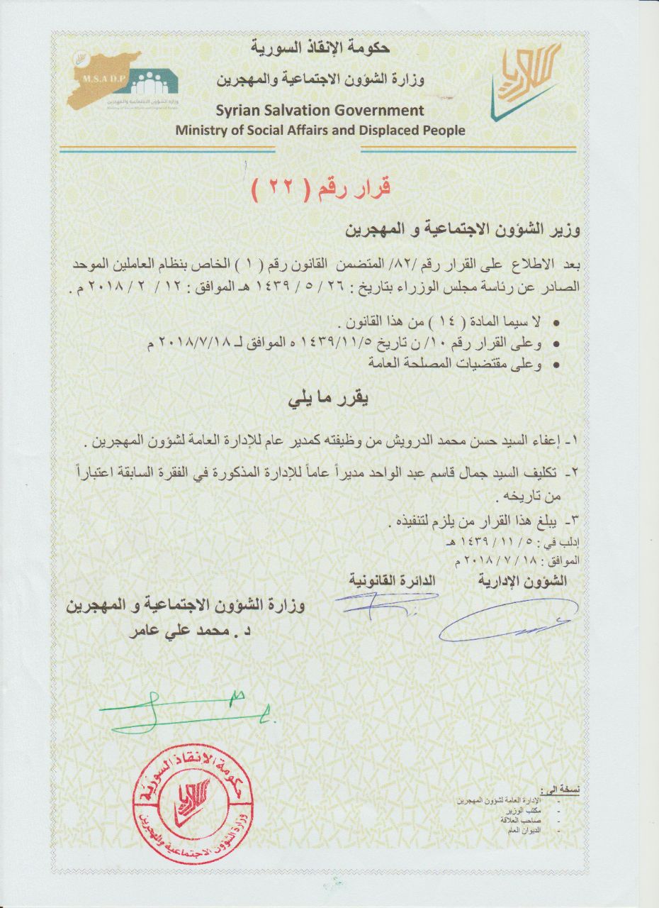 بيان تكليف السيد جمال عبد الواحد مديراً عاماً ” لشؤون المهجرين “