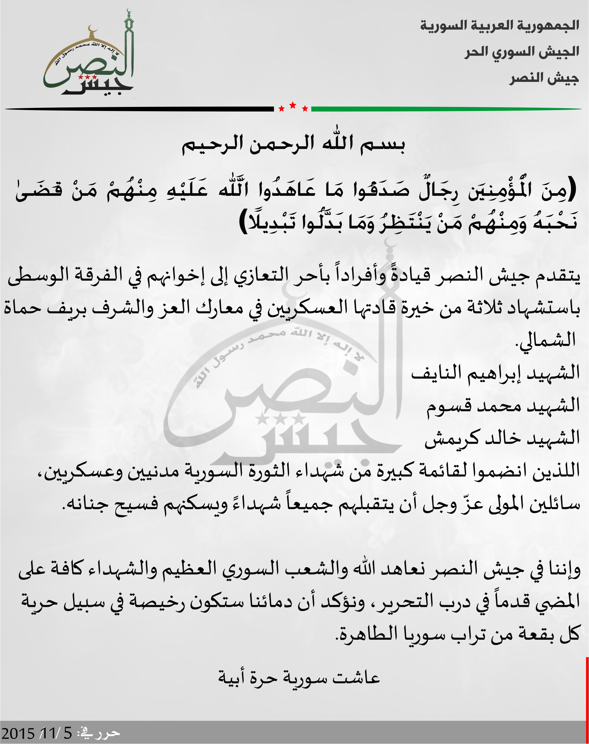 جيش النصر يعزي الفرقة الوسطى باستشهاد ثلاثة من مقاتليها