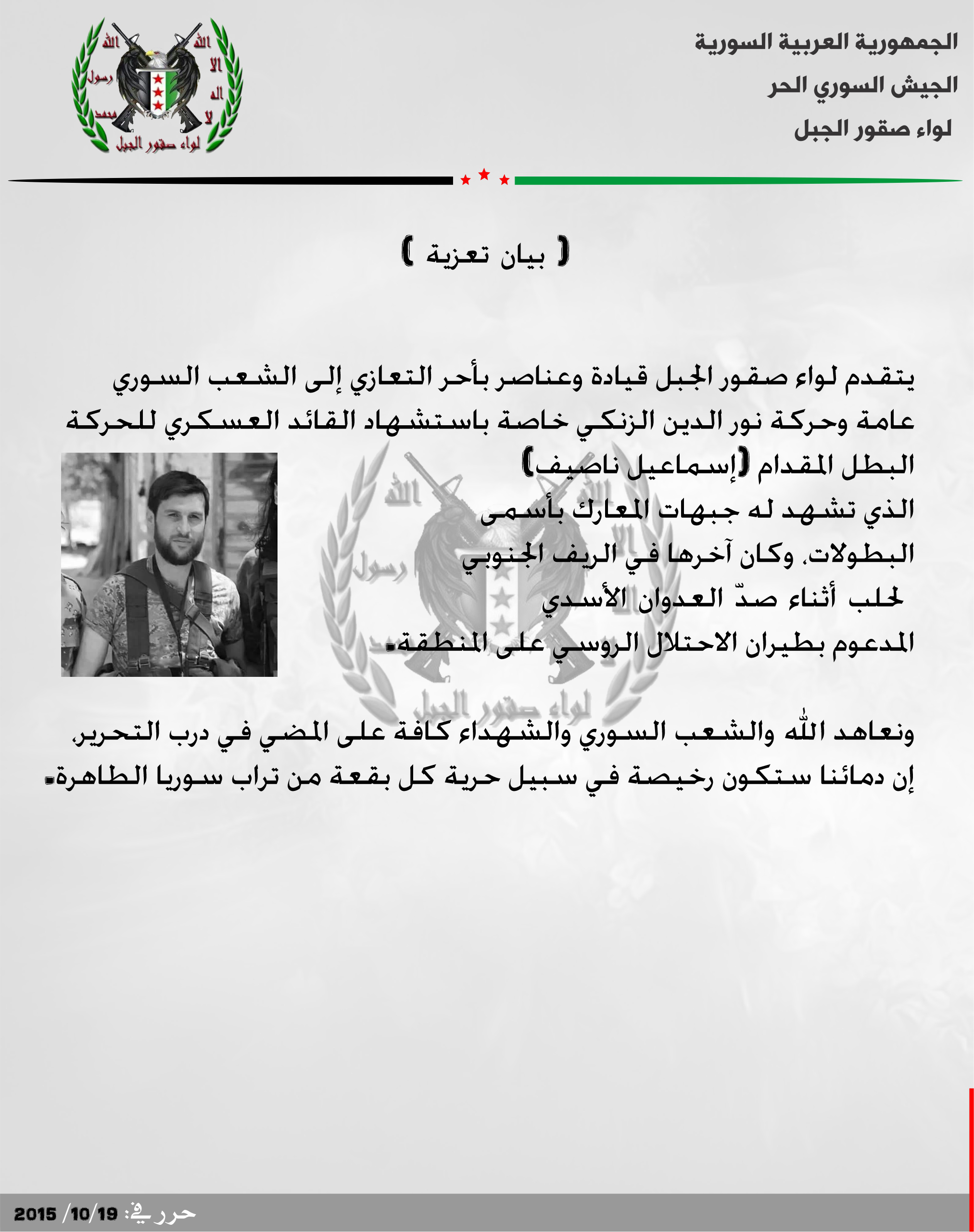 بيان تعزية من لواء صقور الجبل لحركة نور الدين الزنكي باستشهاد أحد قادتها إسماعيل ناصيف