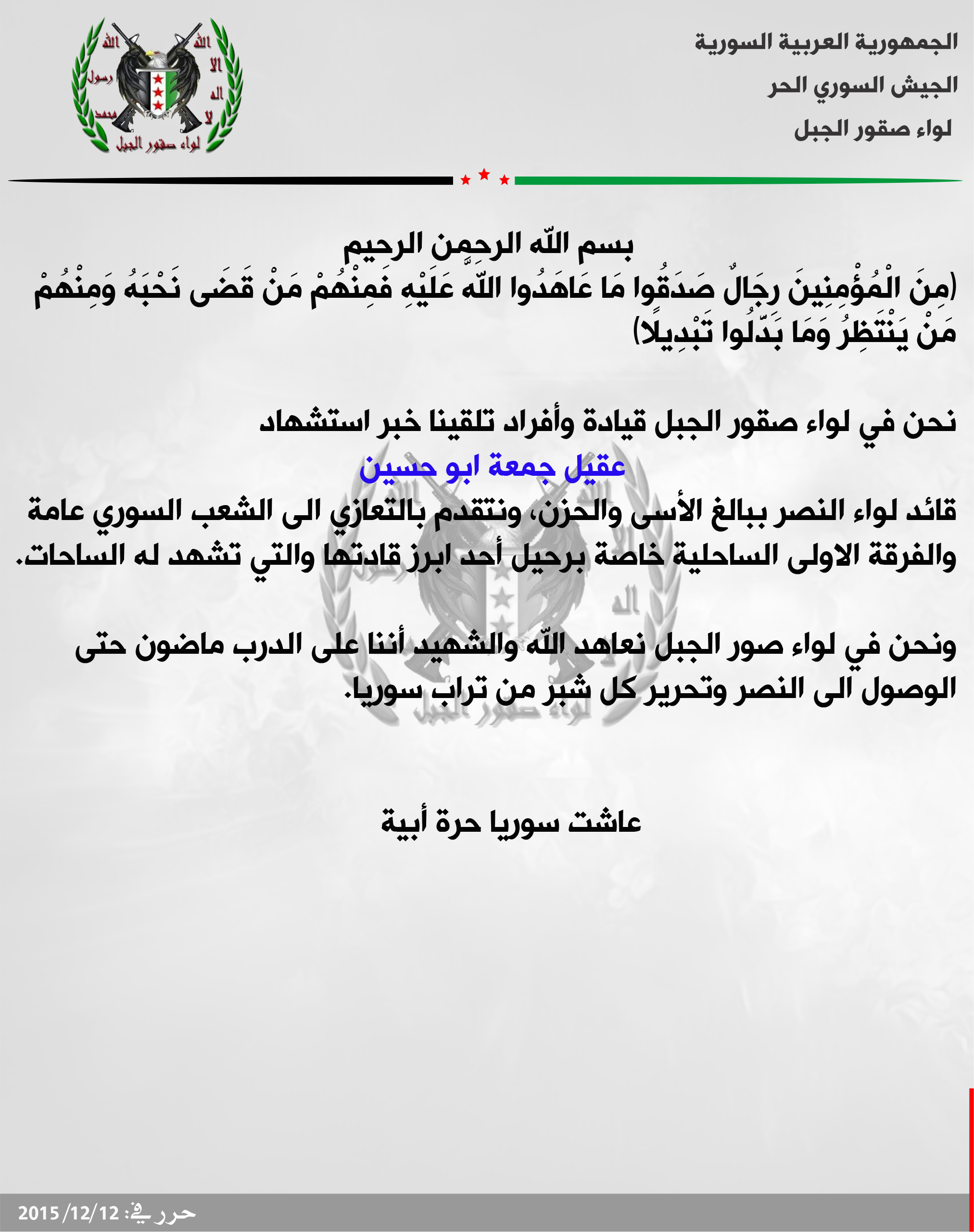 لواء صقور الجبل يعزي لواء النصر باستشهاد قائده