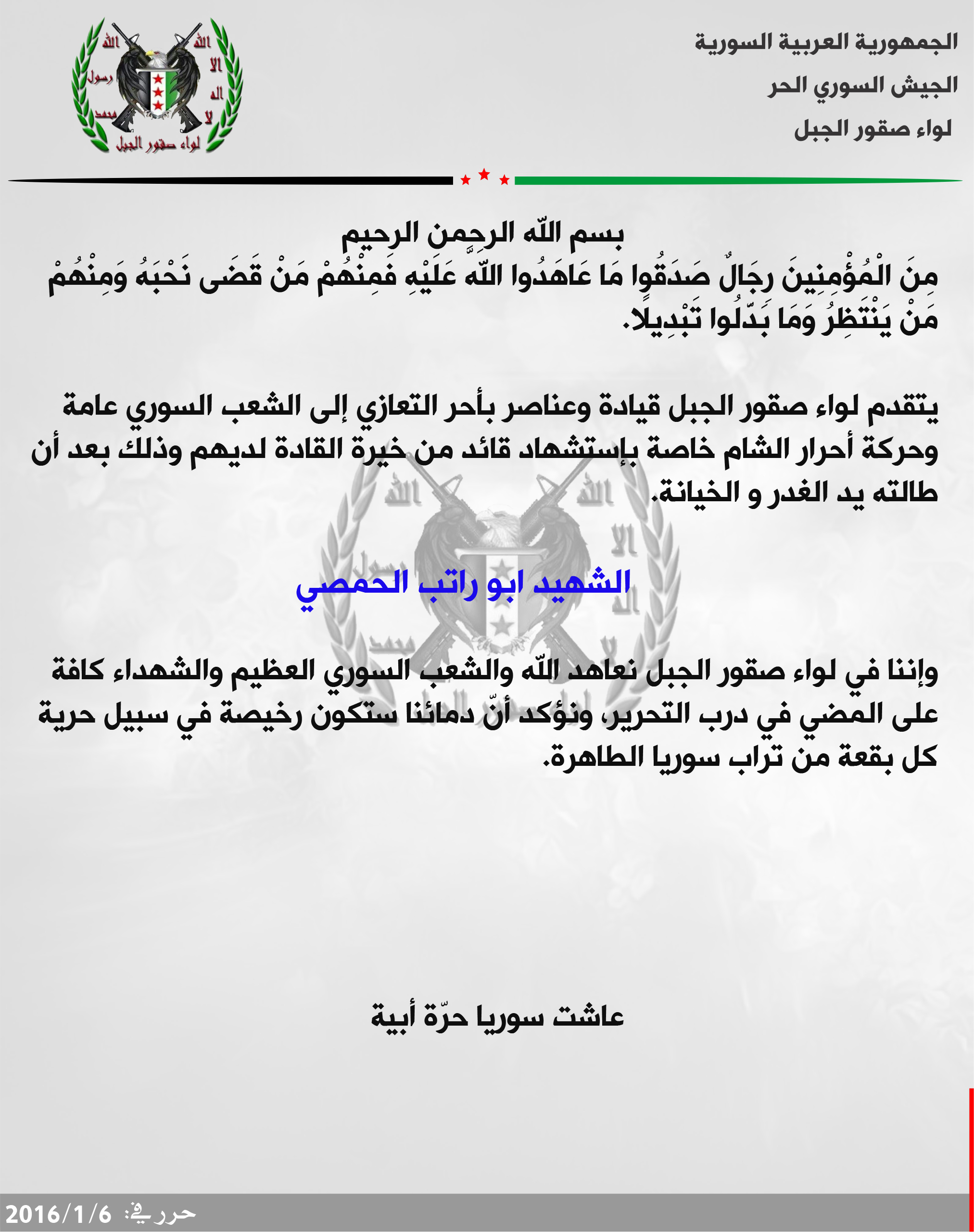 لواء صقور الجبل يعزي أحرار الشام باستشهاد أبو راتب الحمصي أحد قادتها