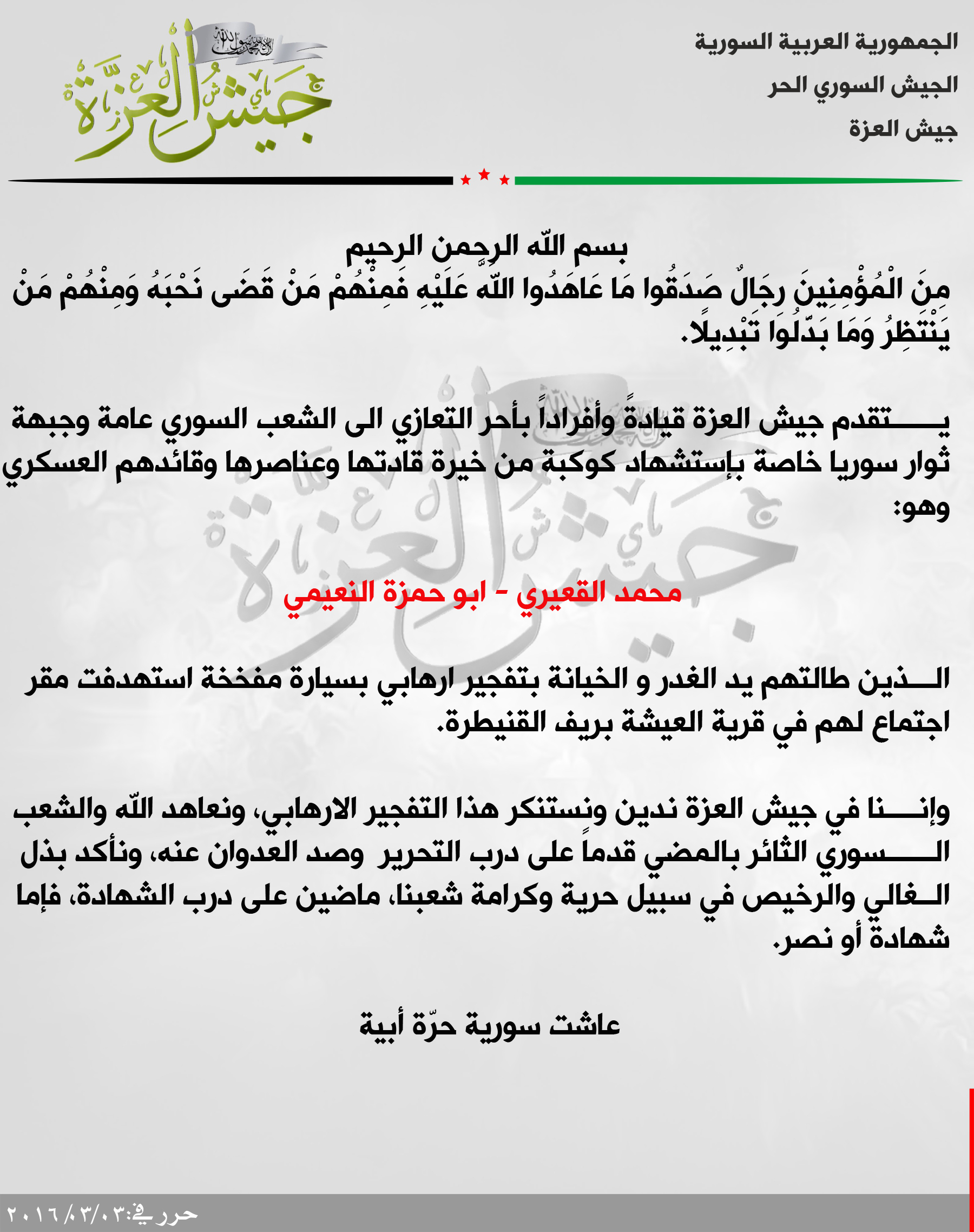 جيش العزة يعزي جبهة ثوار سوريا باستشهاد أبو حمزة النعيمي قائدها العسكري بريف القنيطرة