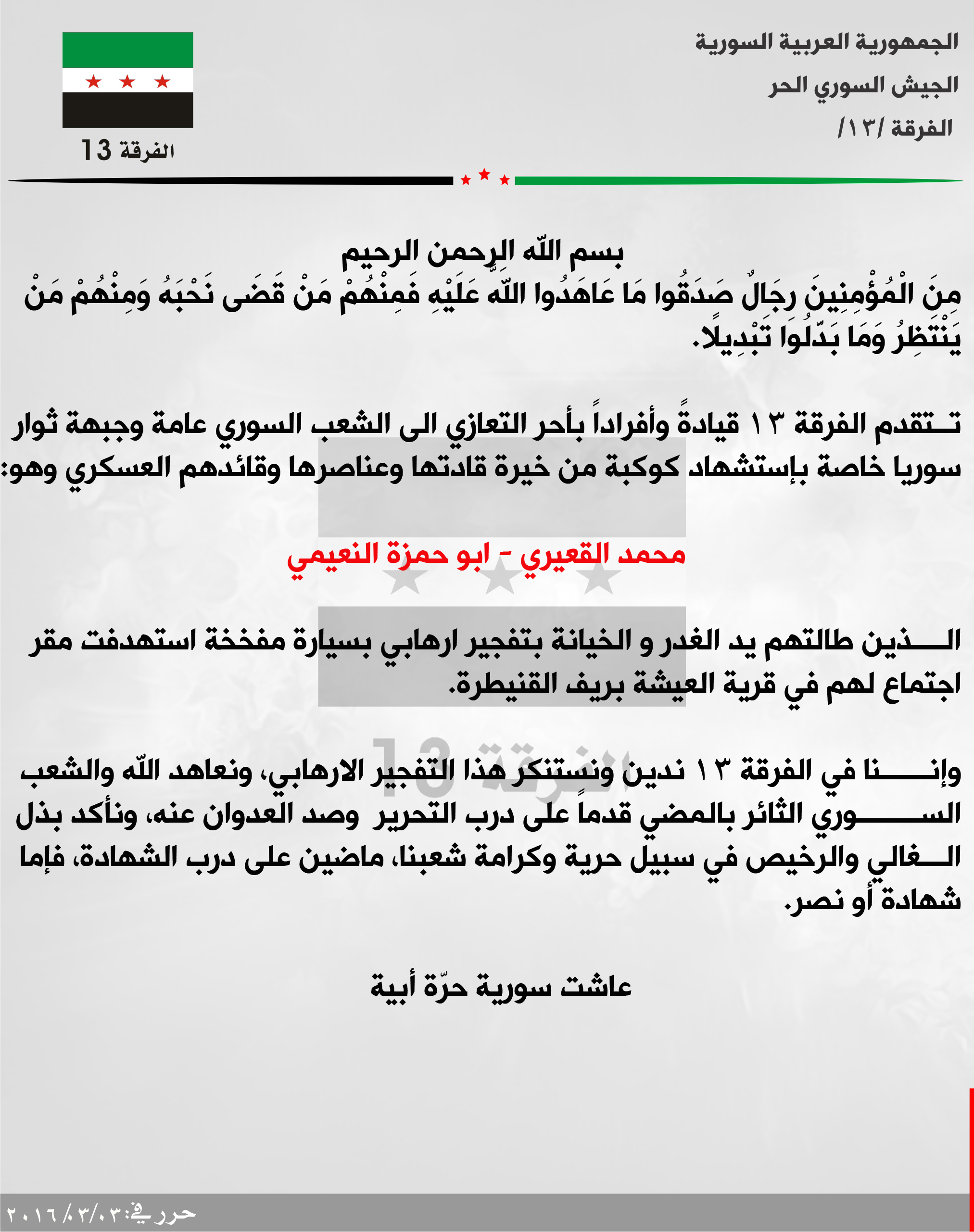 الفرقة 13 تعزي جبهة ثوار سوريا باستشهاد أبو حمزة النعيمي قائدها العسكري في القنيطرة