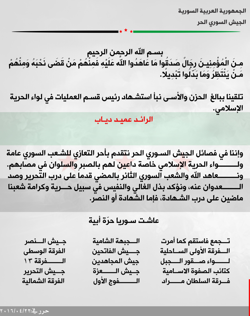 الجيش السوري الحر يعزي لواء الحرية الإسلامي باستشهاد رئيس قسم العمليات لديه الرائد عميد دياب
