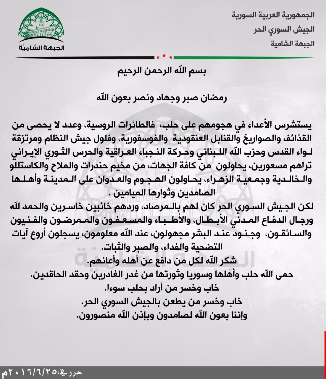 بيان من الجبهة الشامية تحيي فيه صمود المجاهدين في حلب في وجه أعتى القوى