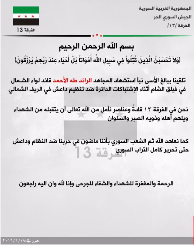 الفرقة 13 تعزي فيلق الشام باستشهاد قائد لواء الشمال طه الأحمد في المعارك ضد داعش