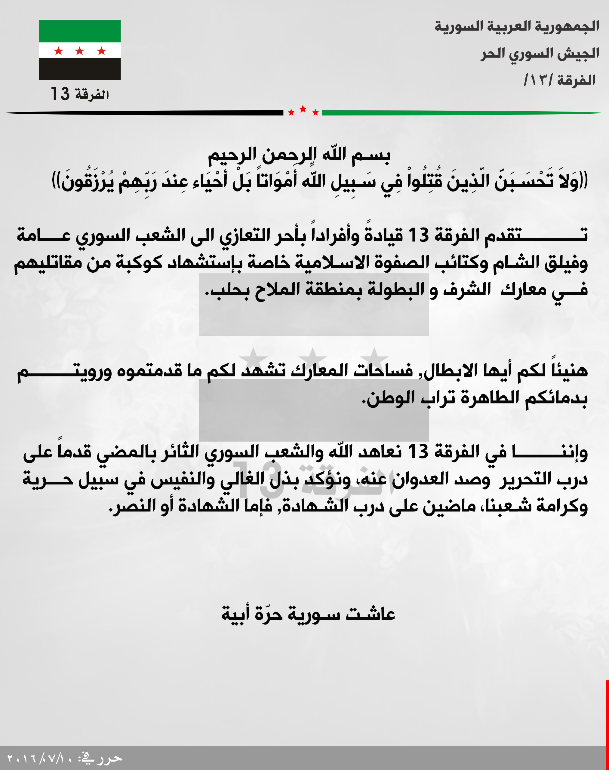 الفرقة 13 تعزي فيلق الشام وكتائب الصفوة باستشهاد عدد من مقاتليهم