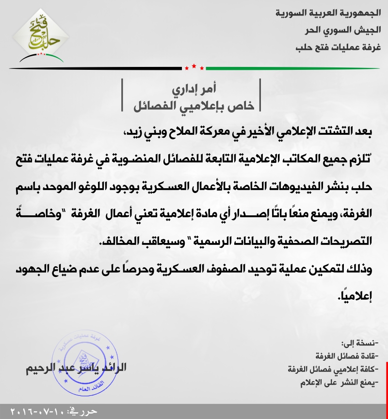 أمر إداري من غرفة عمليات فتح حلب لإعلاميي الفصائل بنشر جميع المواد بلوغو الغرفة حصراً