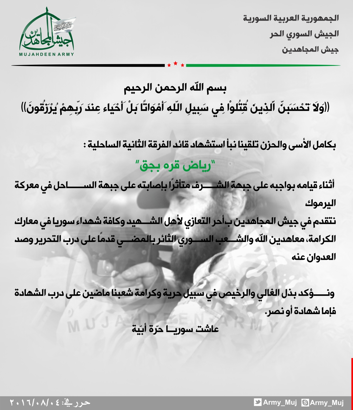 جيش المجاهدين يعزي الفرقة الثانية الساحلية باستشهاد قائدها رياض قرة بجق
