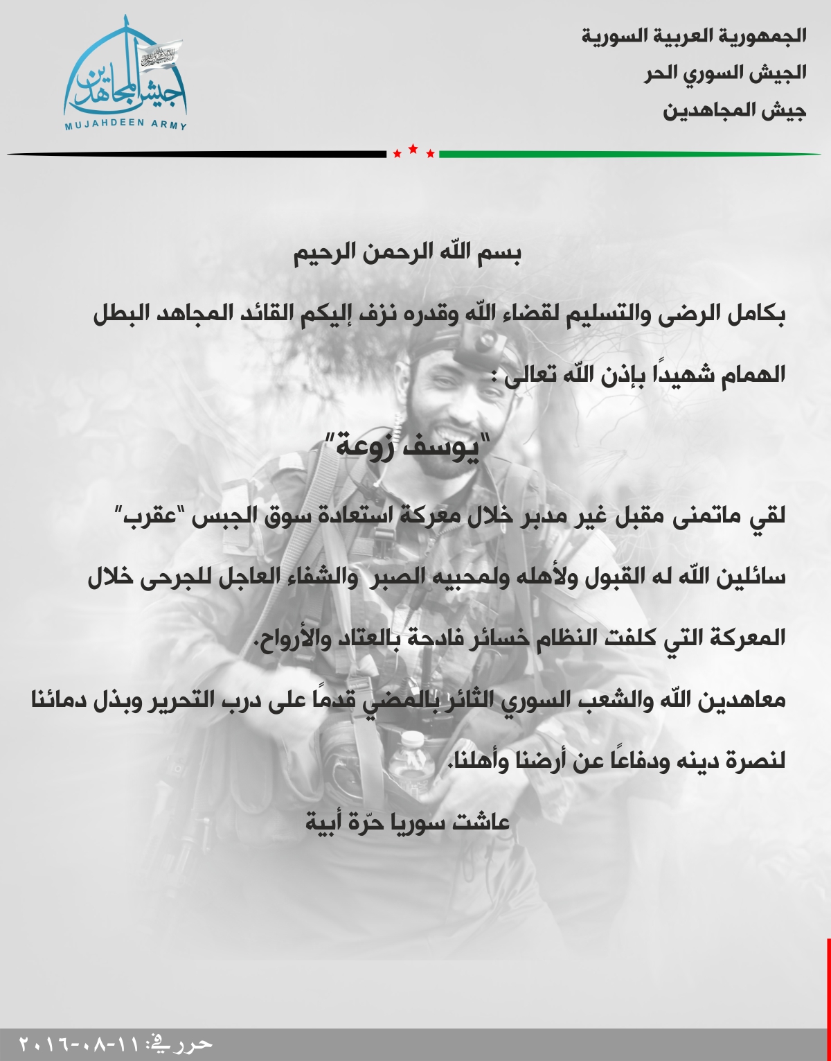 جيش المجاهدين ينعي القائد يوسف زوعة