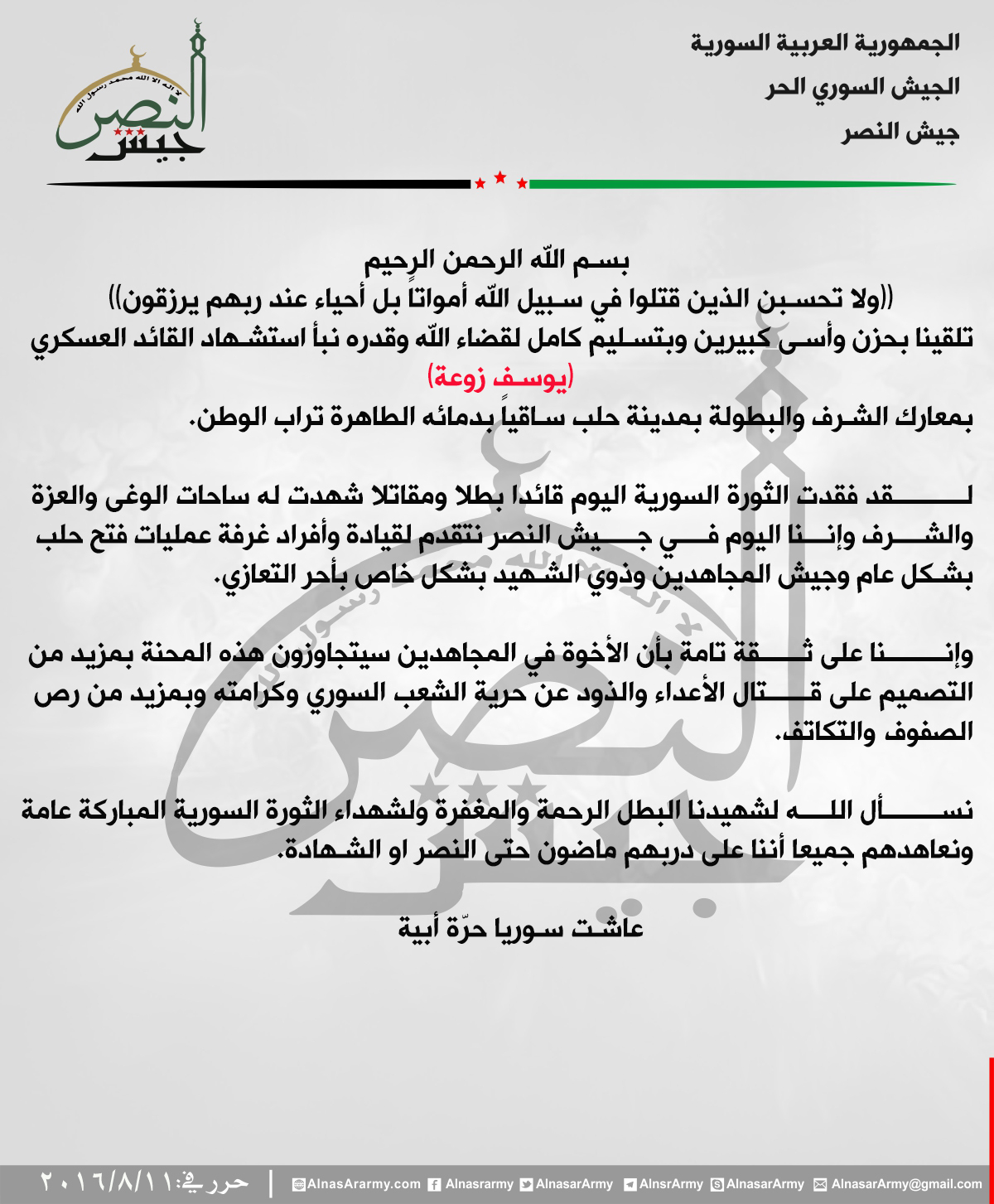 جيش النصر يعزي جيش المجاهدين باستشهاد القائد يوسف زوعة