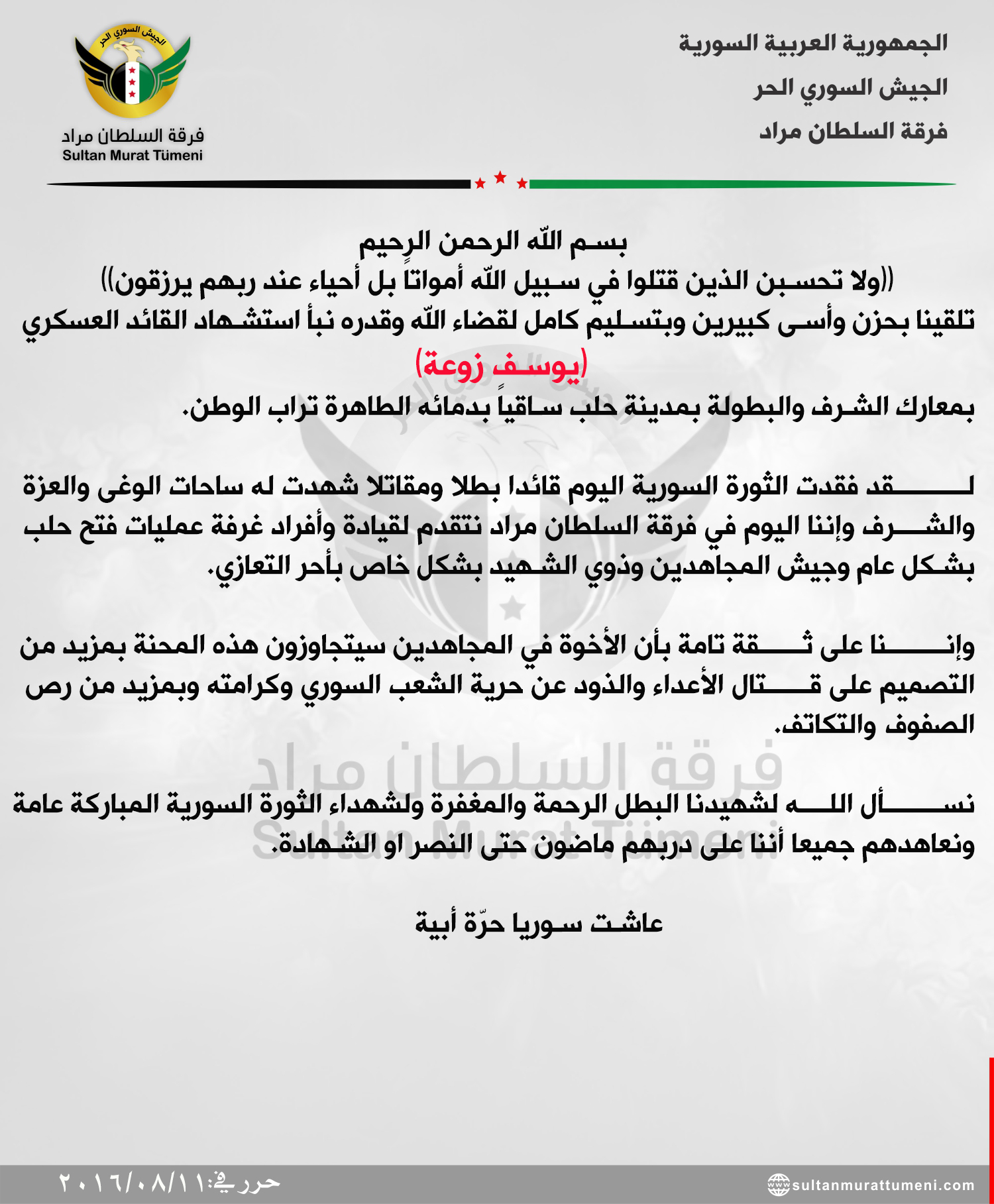 فرقة السطان مراد تعزي جيش المجاهدين باستشهاد القائد يوسف زوعة