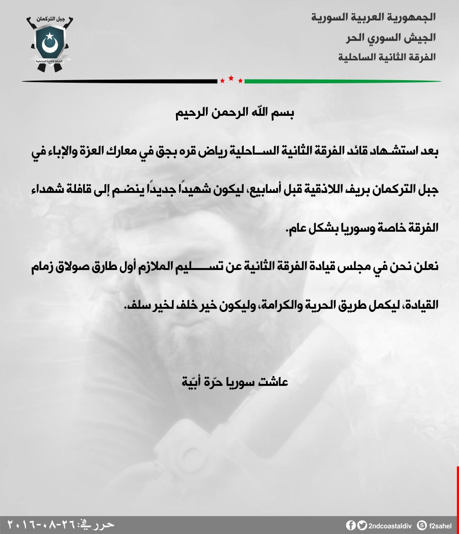 إعلان الفرقة الثانية الساحلية تعيين الملازم أول طارق صولاق قائداً جديداً لها