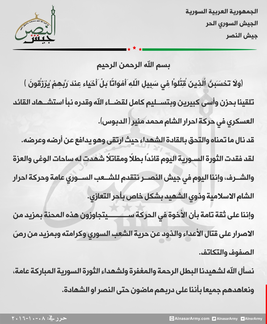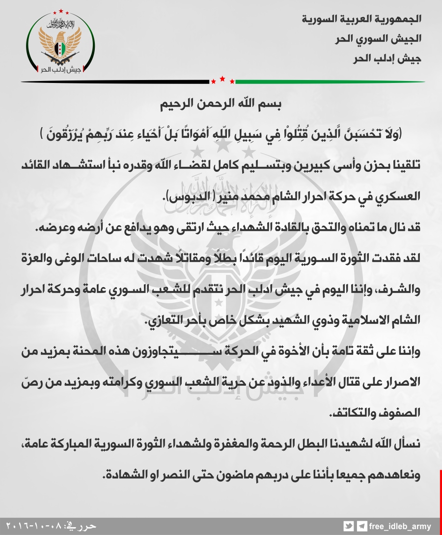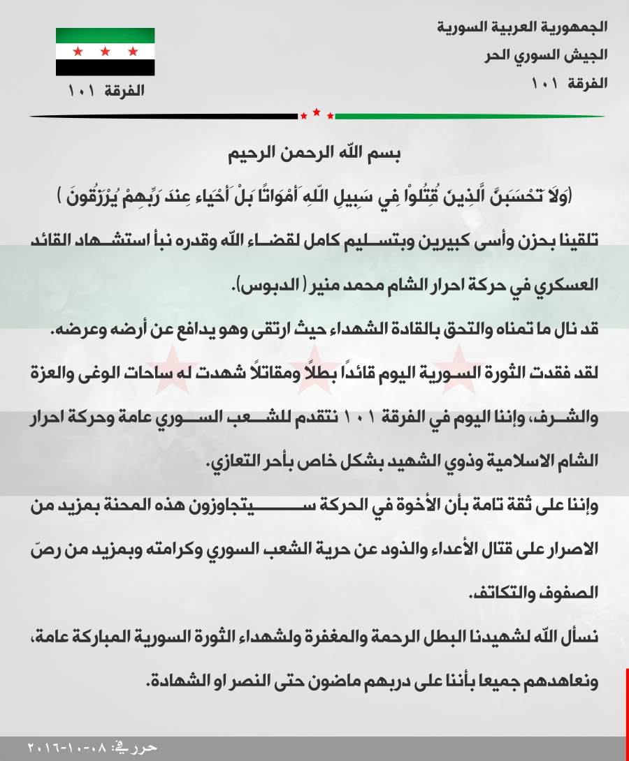 الفرقة101 مشاة وجيش النصر وجيش إدلب الحر يعزون حركة أحرار الشام باستشهاد محمد منير الدبوس أحد قادتها