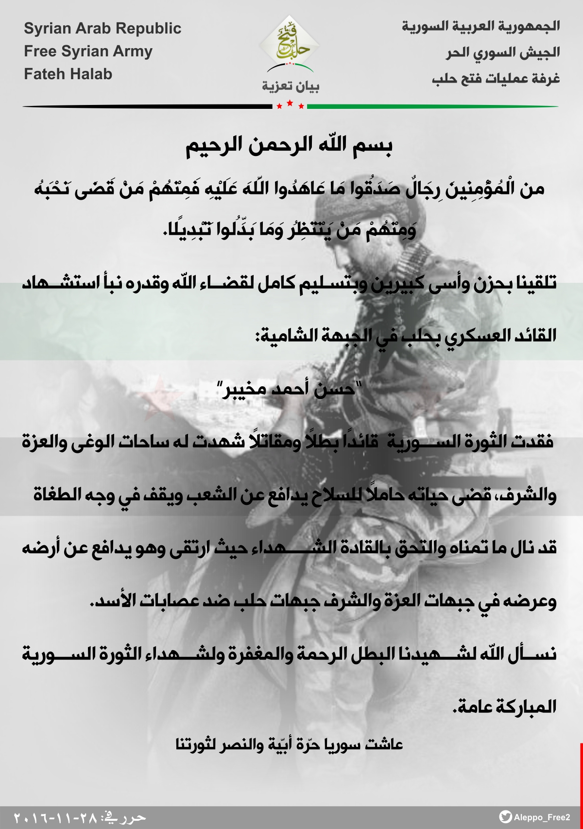 غرفة عمليات فتح حلب تعزي الجبهة الشامية باستشهاد حسن مخيبر أحد قادتها العسكريين