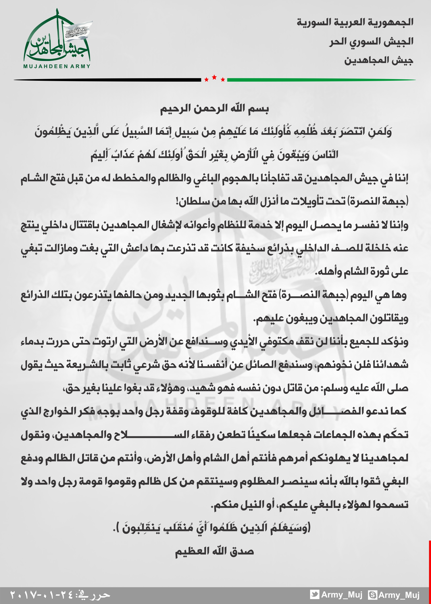 بيان من جيش المجاهدين بشأن هجوم جبهة النصرة عليه