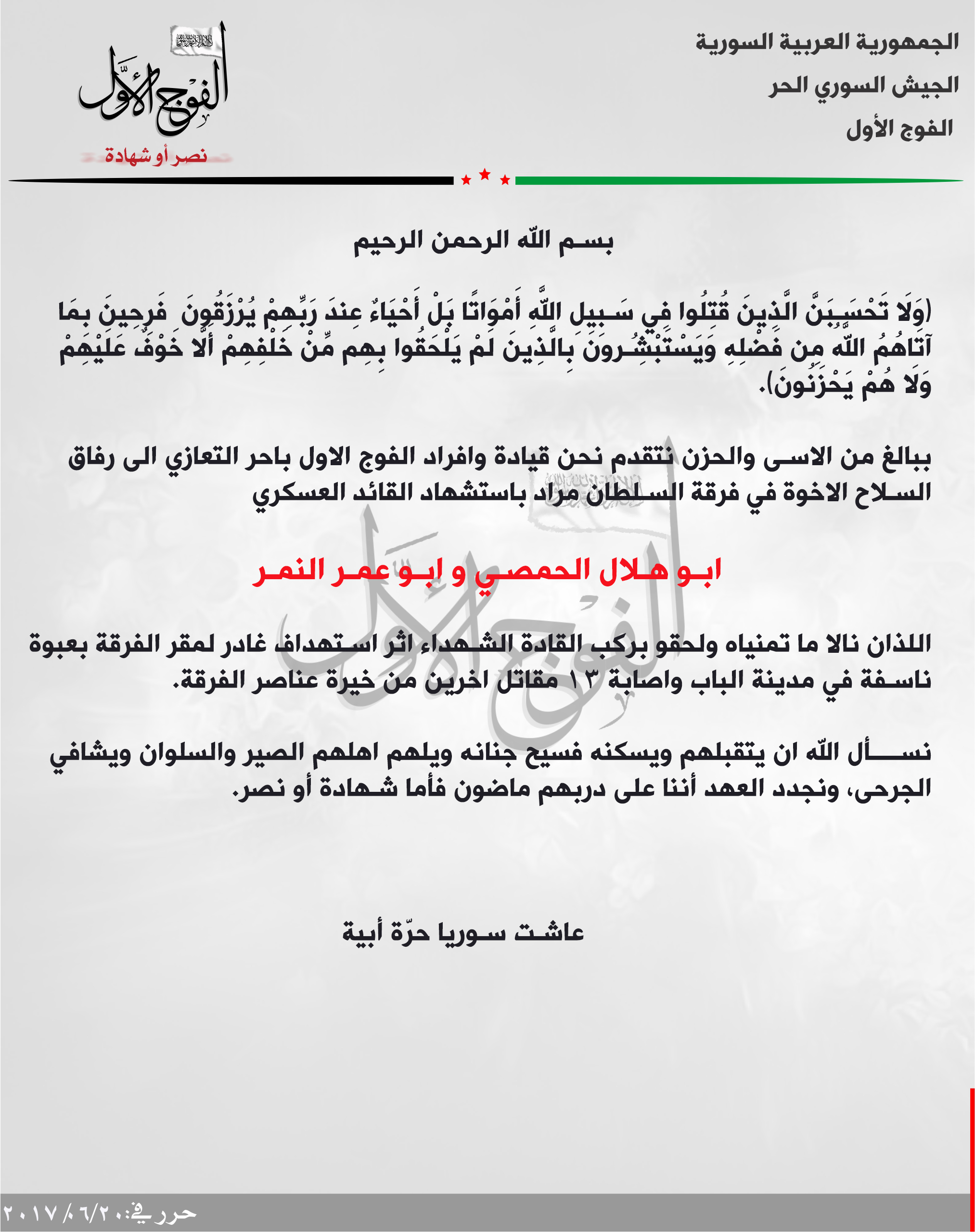 الفوج الأول يعزي فرقة السطان مراد باستشهاد ابو هلال الحمصي وأبو عمر النمر أحد قادتها العسكريين