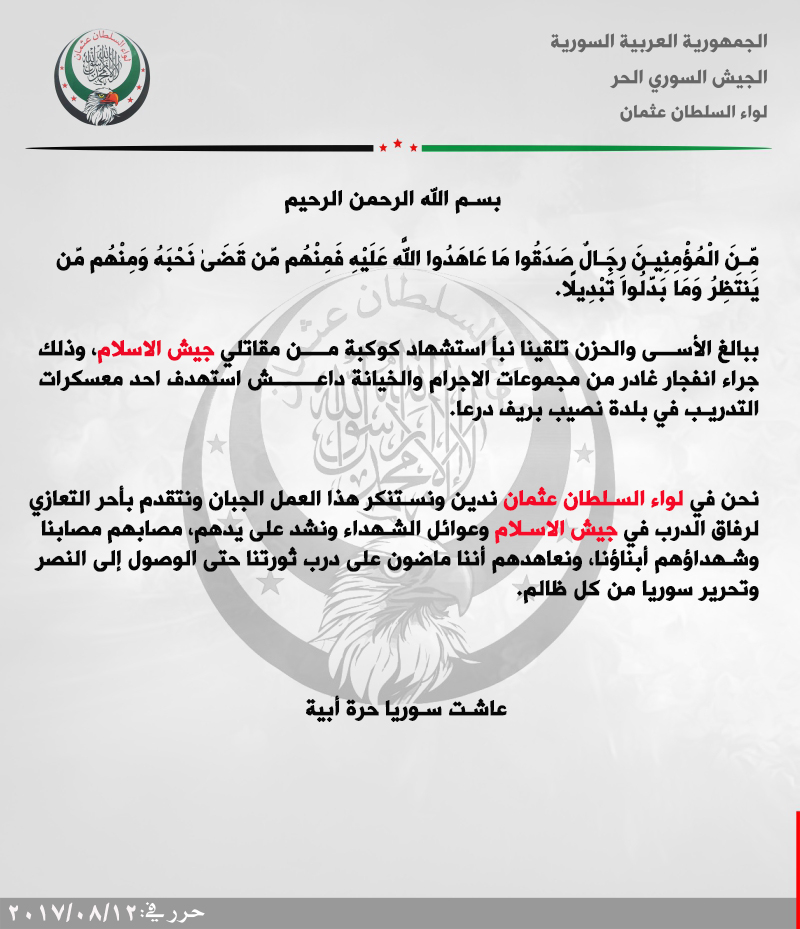 لواء السطان عثمان يعزي جيش الإسلام باستشهاد عدد من مقاتليه بريف درعا