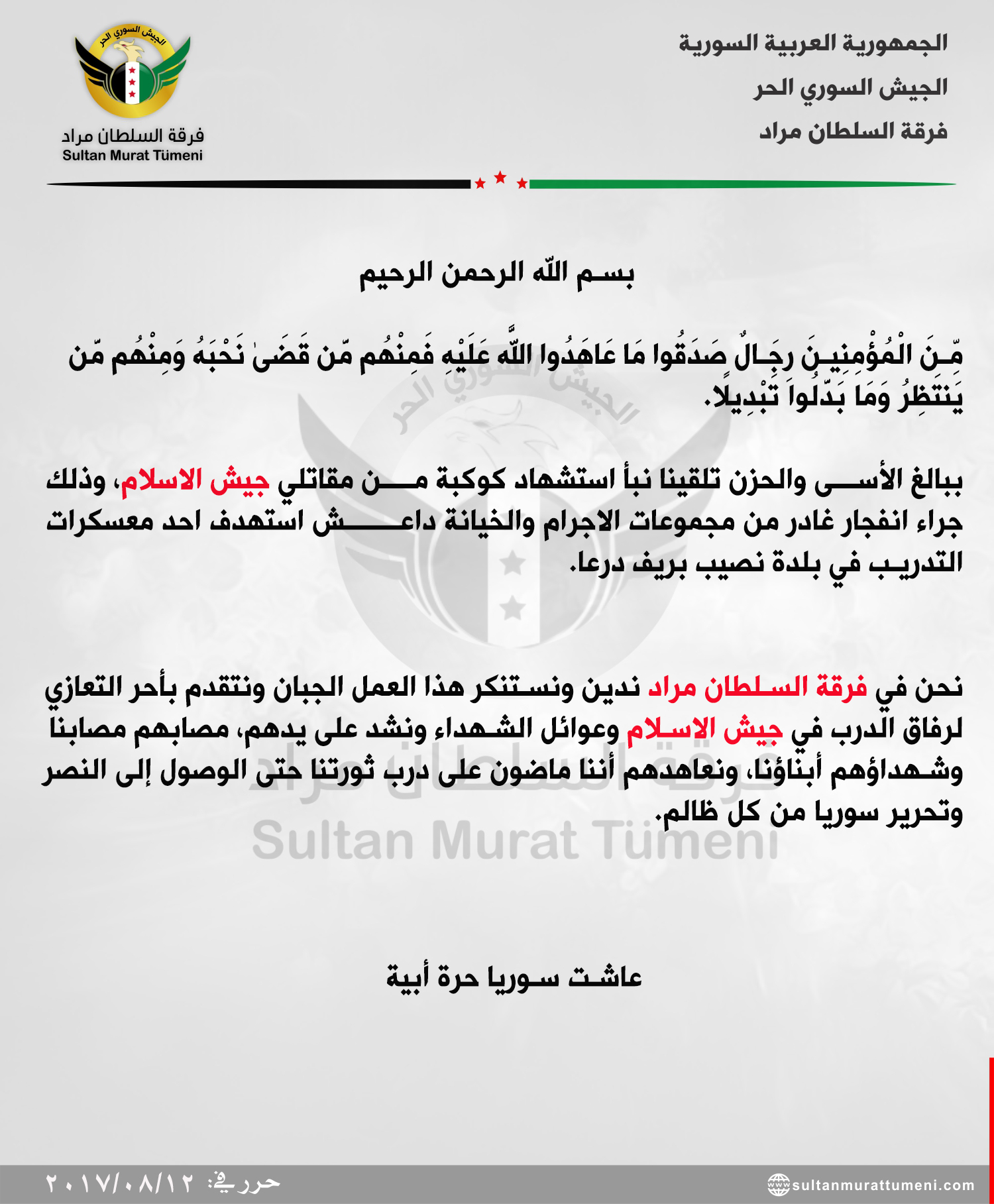 فرقة السطان مراد تعزي جيش الإسلام باستشهاد عدد من مقاتليه بتفجير بريف درعا