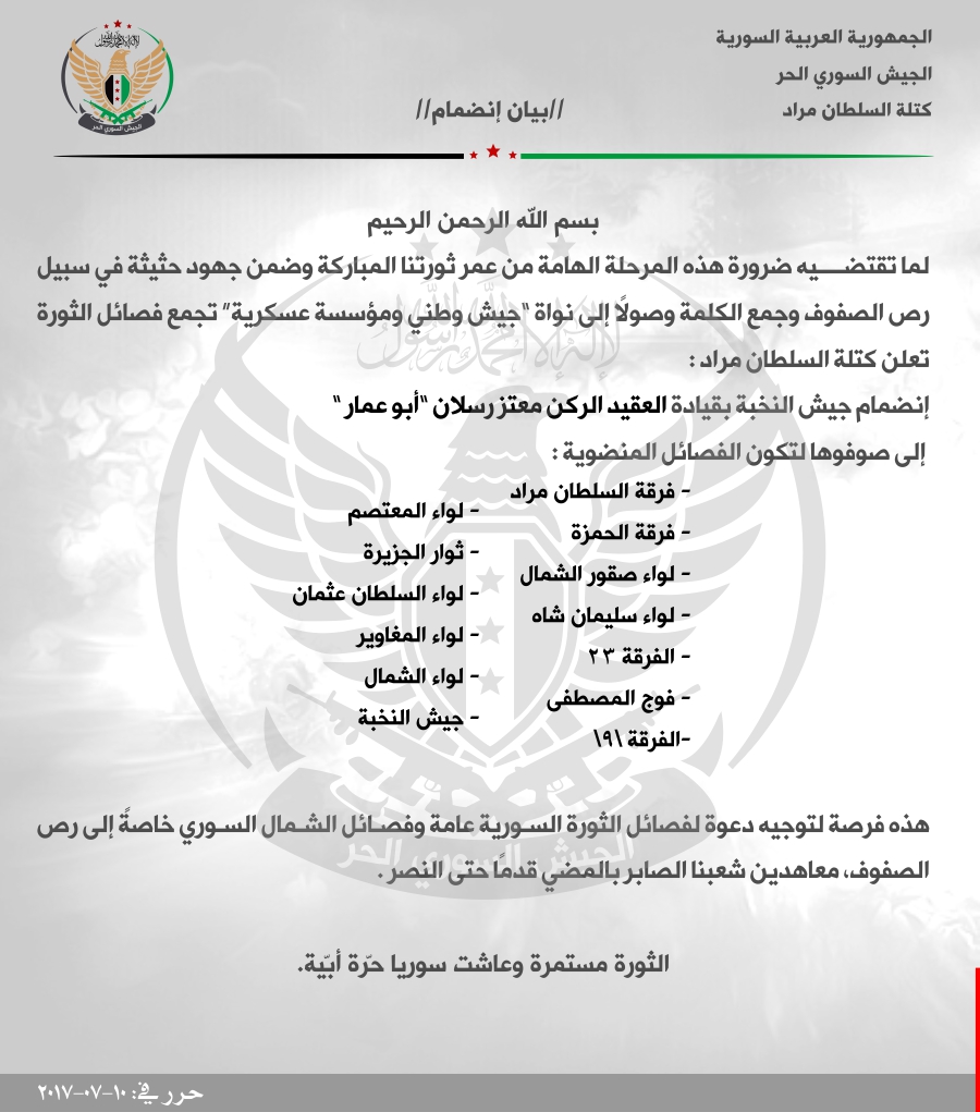 جيش النخبة يعلن انضمامه إلى كتلة السطان مراد