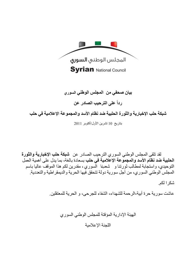 بيان صحفي من المجلس الوطني رداً على الترحيب الصادر عن شبكة حلب الإخبارية والثورة الحلبية ضد نظام الأسد والمجموعة الإعلامية في حلب