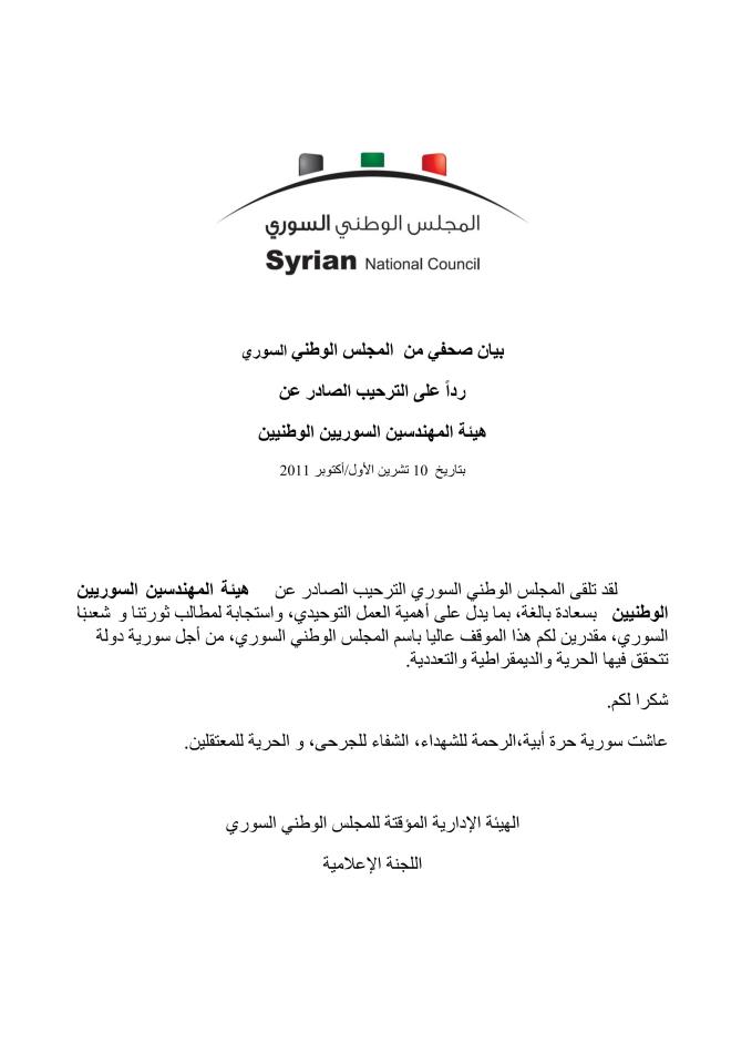 بيان صحفي من المجلس الوطني رداً على الترحيب الصادر عن هيئة المهندسين السوريين الوطنيين