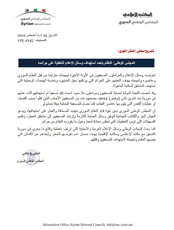 إن المجلس الوطني السوري يدين بقوة قيام النظام السوري بتهديد الصحافة والعمل على استهدافها، ويدعو الجيش الحرّ والكتائب الميدانية لتوفير وسائل الحماية اللازمة وإرشاد الصحفيين إلى مناطق الخطر، وتقديم التسهيلات التي تؤمن التغطيات التي تعكس معاناة شعبنا وهول ما يقوم به النظام من جرائم.
