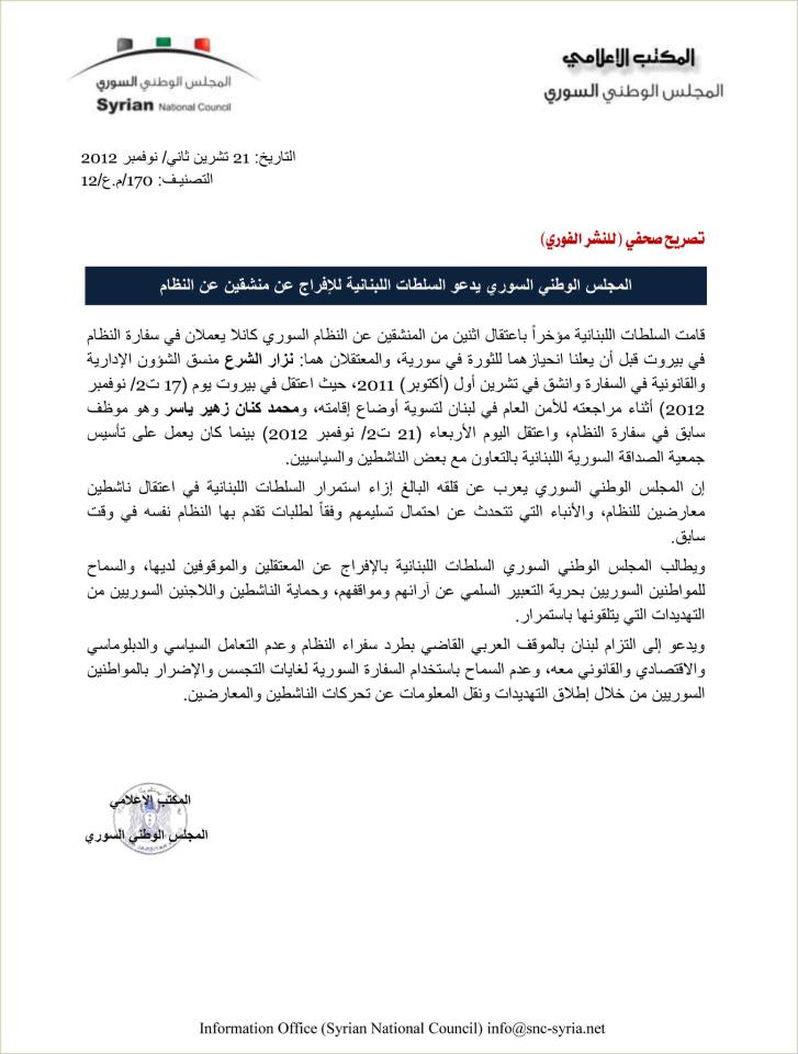 إن المجلس الوطني السوري يعرب عن قلقه البالغ إزاء استمرار السلطات اللبنانية في اعتقال ناشطين معارضين للنظام، والأنباء التي تتحدث عن احتمال تسليمهم وفقاً لطلبات تقدم بها النظام نفسه في وقت سابق.