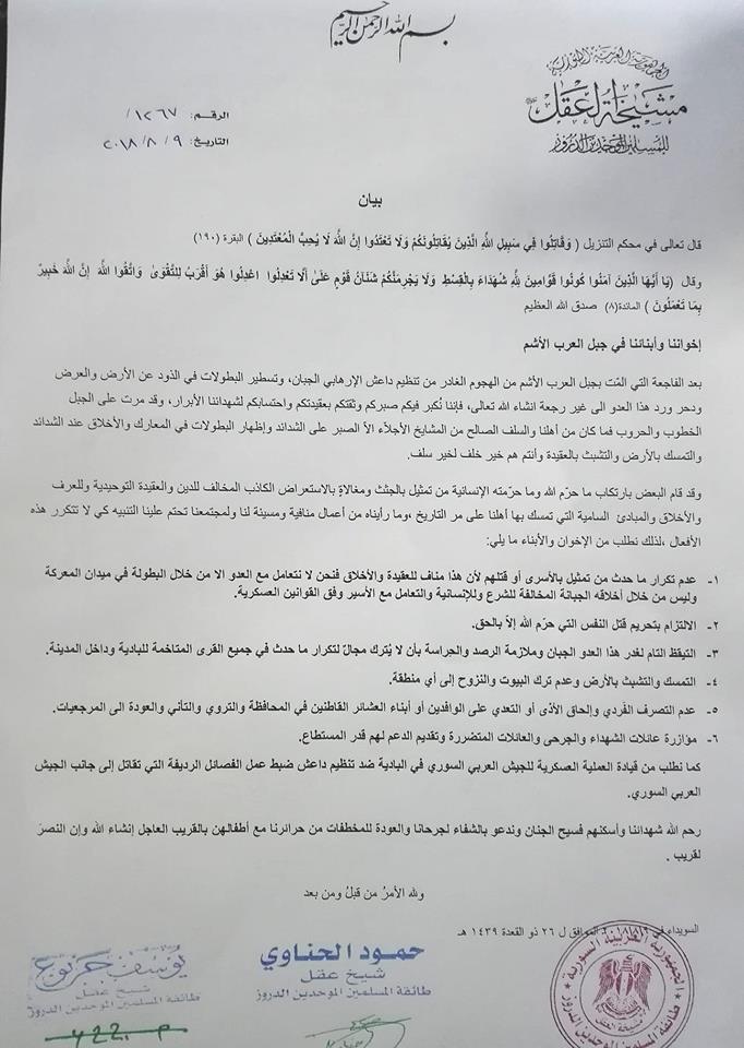 مشيخة عقل المسلمين الموحدين الدروز تدين بعض الأعمال الفردية التي حصلت في المعارك وبعدها وتحرمها
