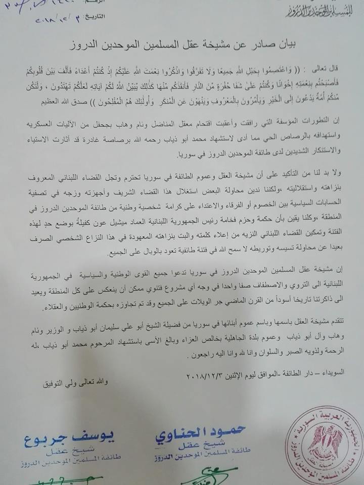 بيان صادر عن مشيخة عقل المسلمين الموحدين الدروز في سوريا تندد وتستنكر اقتحام معقل وئام وهاب