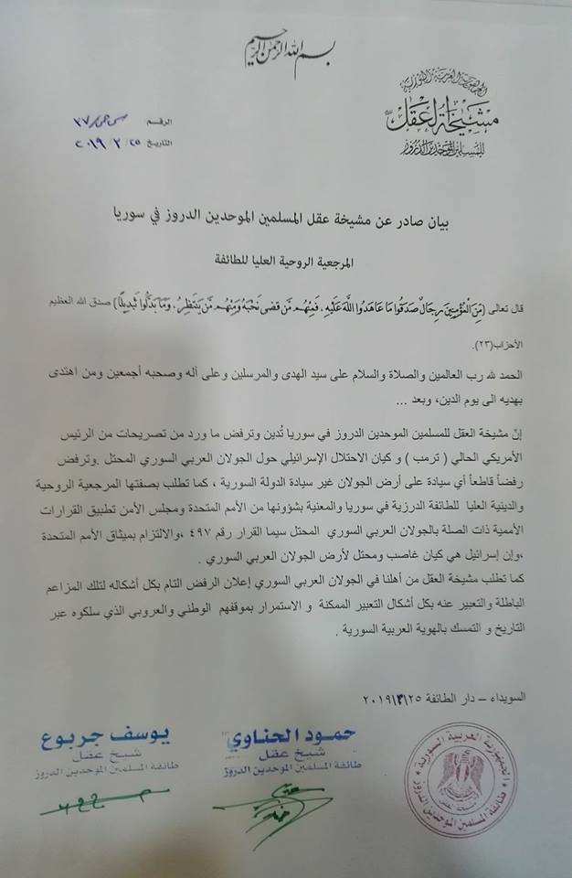 إنّ مشيخة العقل للمسلمين الموحدين الدروز في سوريا تُدين وترفض ما ورد من تصريحات من الرئيس الأمريكي الحالي ( ترمب ) و كيان الاحتلال الإسرائيلي حول الجولان العربي السوري المحتل .وترفض رفضاً قاطعاً أي سيادة على أرض الجولان غير سيادة الدولة السورية , كما تطلب بصفتها المرجعية الروحية والدينية العليا للطائفة الدرزية في سوريا والمعنية بشؤونها من الأمم المتحدة ومجلس الأمن تطبيق القرارات الأممية ذات الصلة بالجولان السوري المحتل سيما القرار رقم 497 ,والالتزام بميثاق الأمم المتحدة ,وأن إسرائيل هي كيان غاصب ومحتل لأرض الجولان العربي السوري .