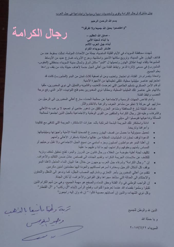 • ان "رجال الكرامة" وشرفاء جبل العرب يوجهون من خلال هذا البيان النداء العاجل لأهلنا البدو بوقف كل أشكال الترحيل ومغادرة أسرهم لمساكنهم والعودة اليها مطمئنين آمنين مكرمين.