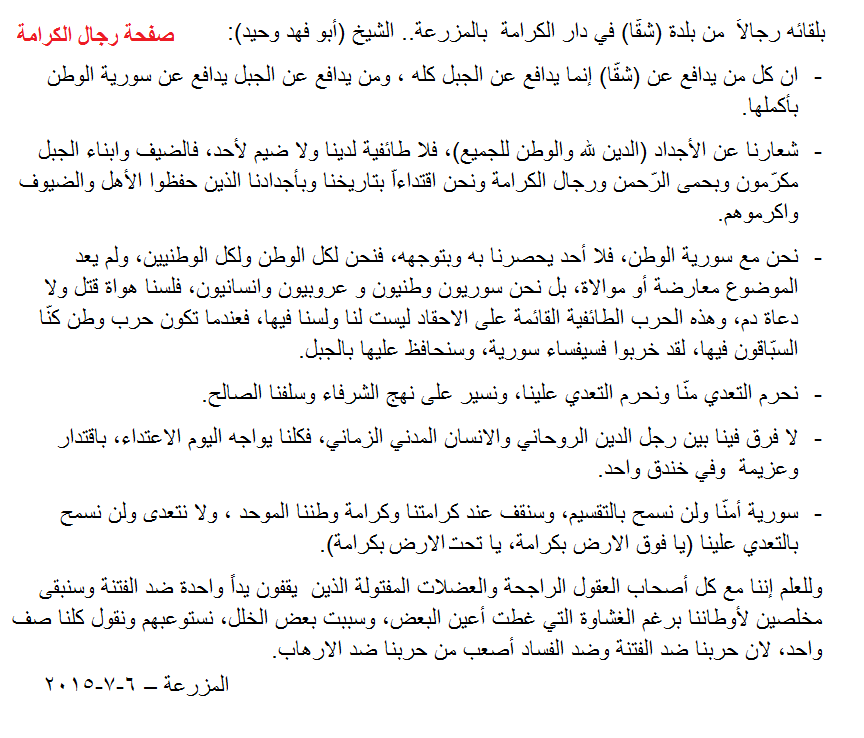 - نحن مع سورية الوطن, فلا أحد يحصرنا به وبتوجهه, فنحن لكل الوطن ولكل الوطنيين, ولم يعد الموضوع معارضة أو موالاة, بل نحن سوريون وطنيون و عروبيون وانسانيون, فلسنا هواة قتل ولا دعاة دم, وهذه الحرب الطائفية القائمة على الاحقاد ليست لنا ولسنا فيها, فعندما تكون حرب وطن كنّا السبّاقون فيها, لقد خربوا فسيفساء سورية, وسنحافظ عليها بالجبل.