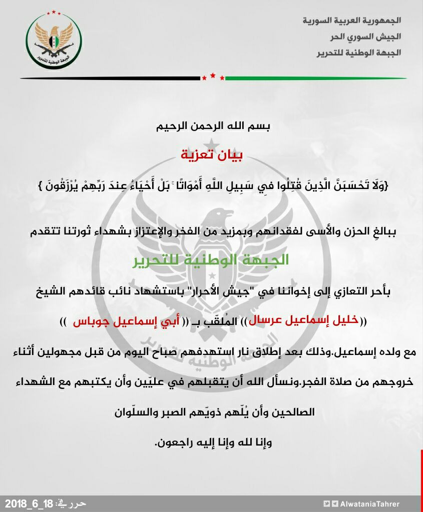 الجبهة الوطنية للتحرير تعزي جيش الأحرار باستشهاد نائب قائده خليل إسماعيل عرسال