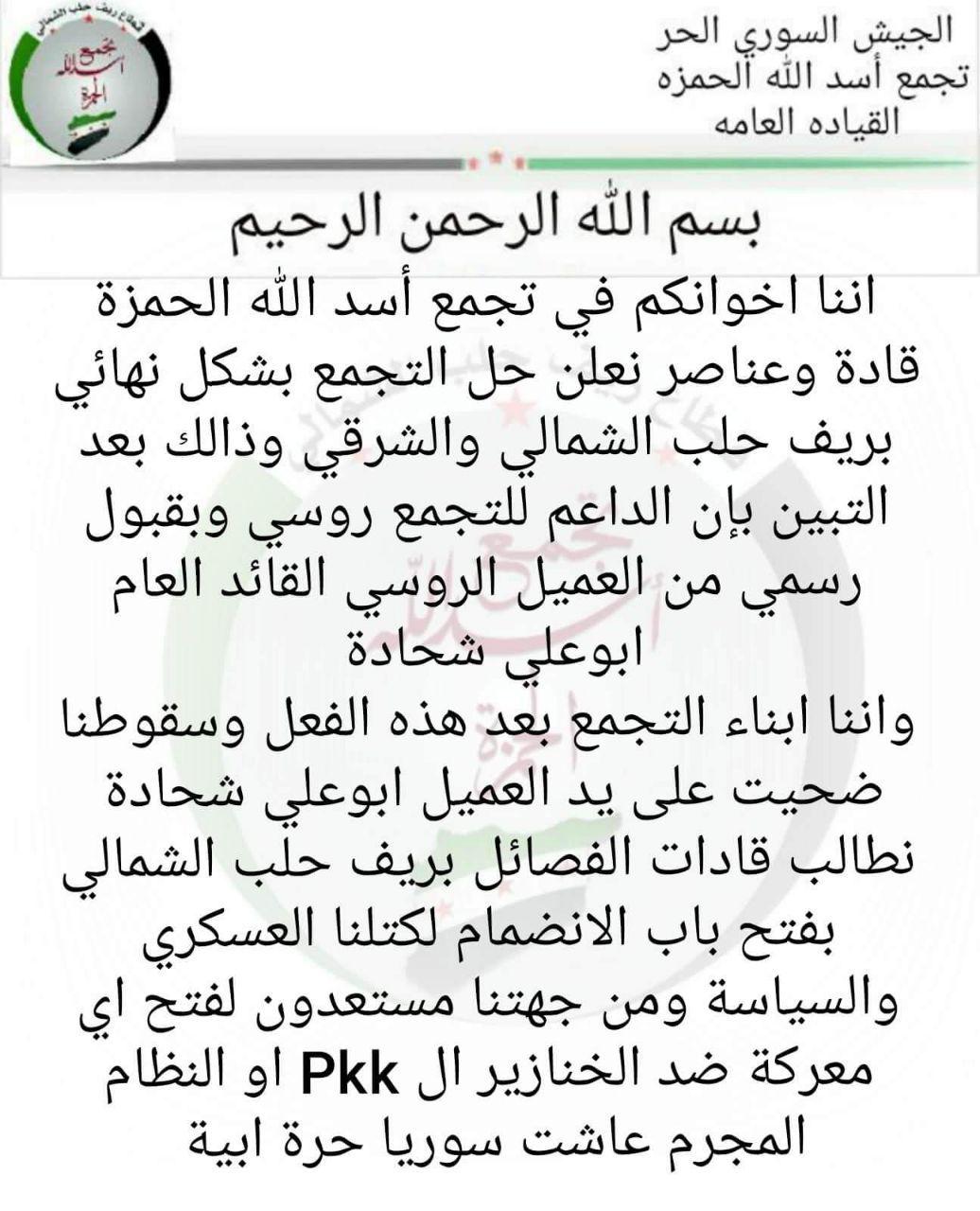 إننا اخوانكم في تجمع أسد الله الحمزة قادة وعناصر نعلن حل التجمع بشكل نهائي بريف حلب الشمالي والشرقي، وذلك بعد التبين بأن الداعم للتجمع روسي وبقبول رسمي من القائد العام "أبو علي شحادة
