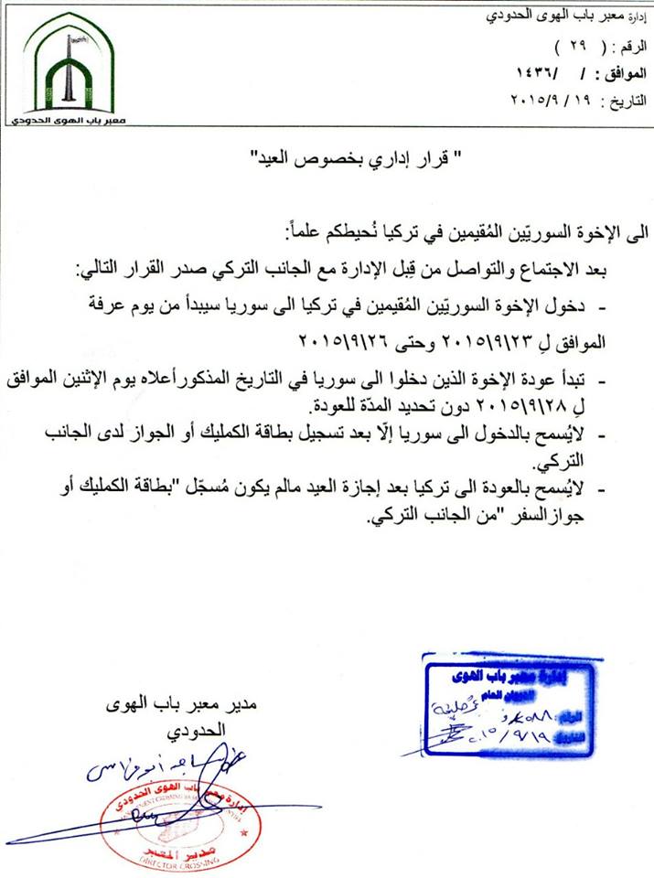 2_تبدأ عودة الإخوة الذين دخلوا إلى سوريا في التاريخ المذكور أعلاه يوم الإثنين الموافق لِ 28\9\2015 دون تحديد المدة للعودة.