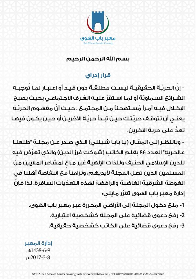 قرار إداري بمنع دخول مجلة "طلعنا عالحريّة"