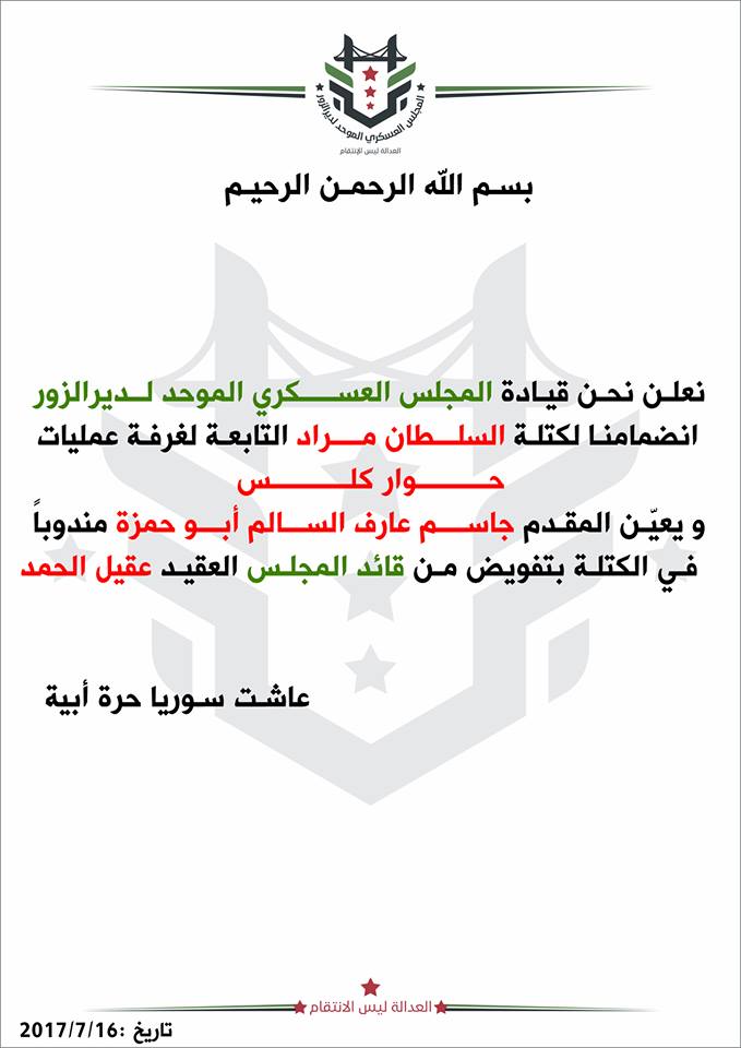 بيان انضمام المجلس العسكري الموحد لديرالزور إلى كتلة السلطان مراد التابعة لغرفة عملية حوار كلس