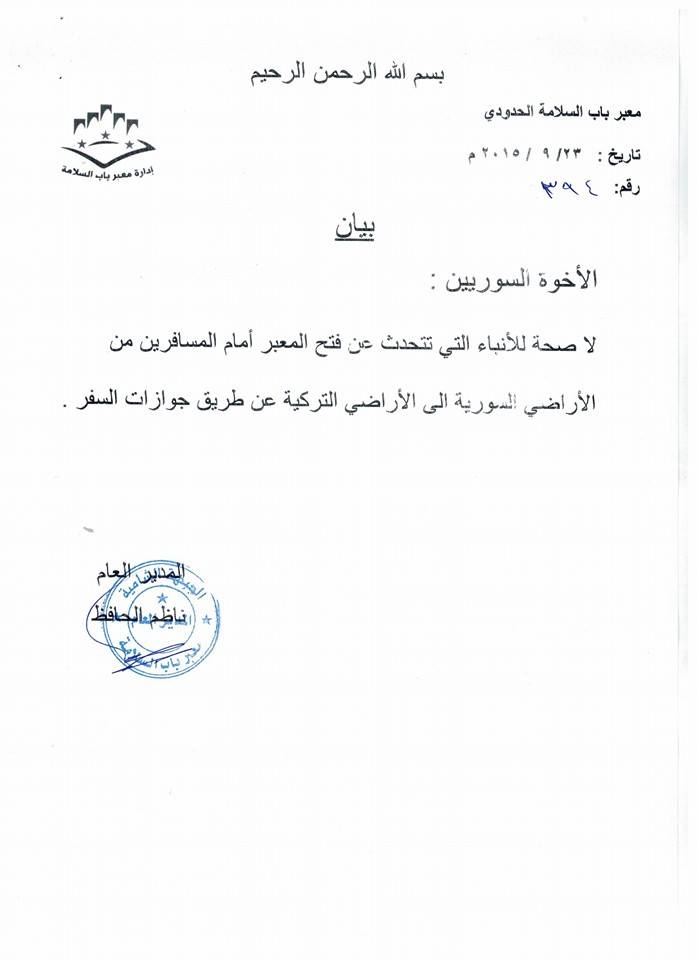 إدارة معبر باب السلامة تنفي فتح المعبر للمسافرين إلى الأراضي التركية عن طريق جواز السفر