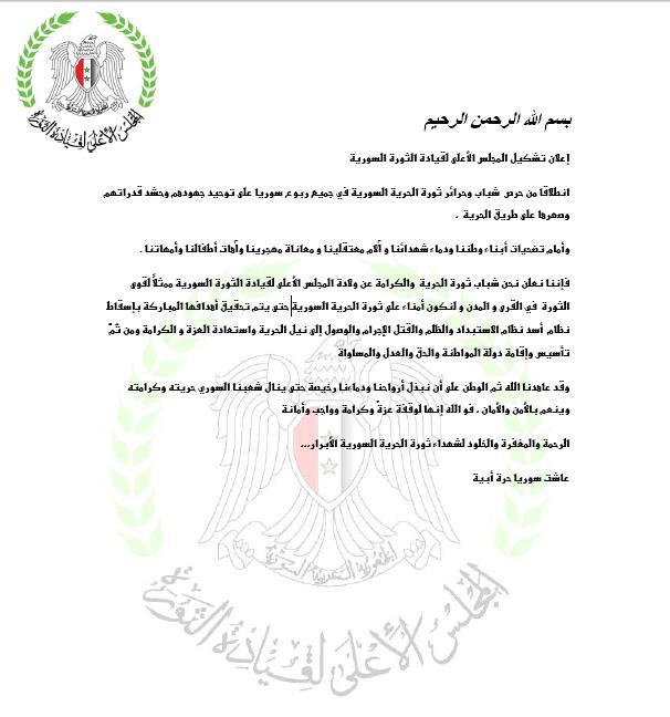 فإننا نعلن نحن شباب ثورة الحرية والكرامة عن ولادة المجلس الأعلى لقيادة الثورة السورية ممثلاً لقوى